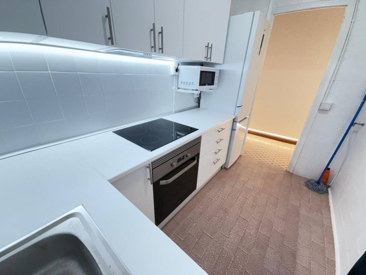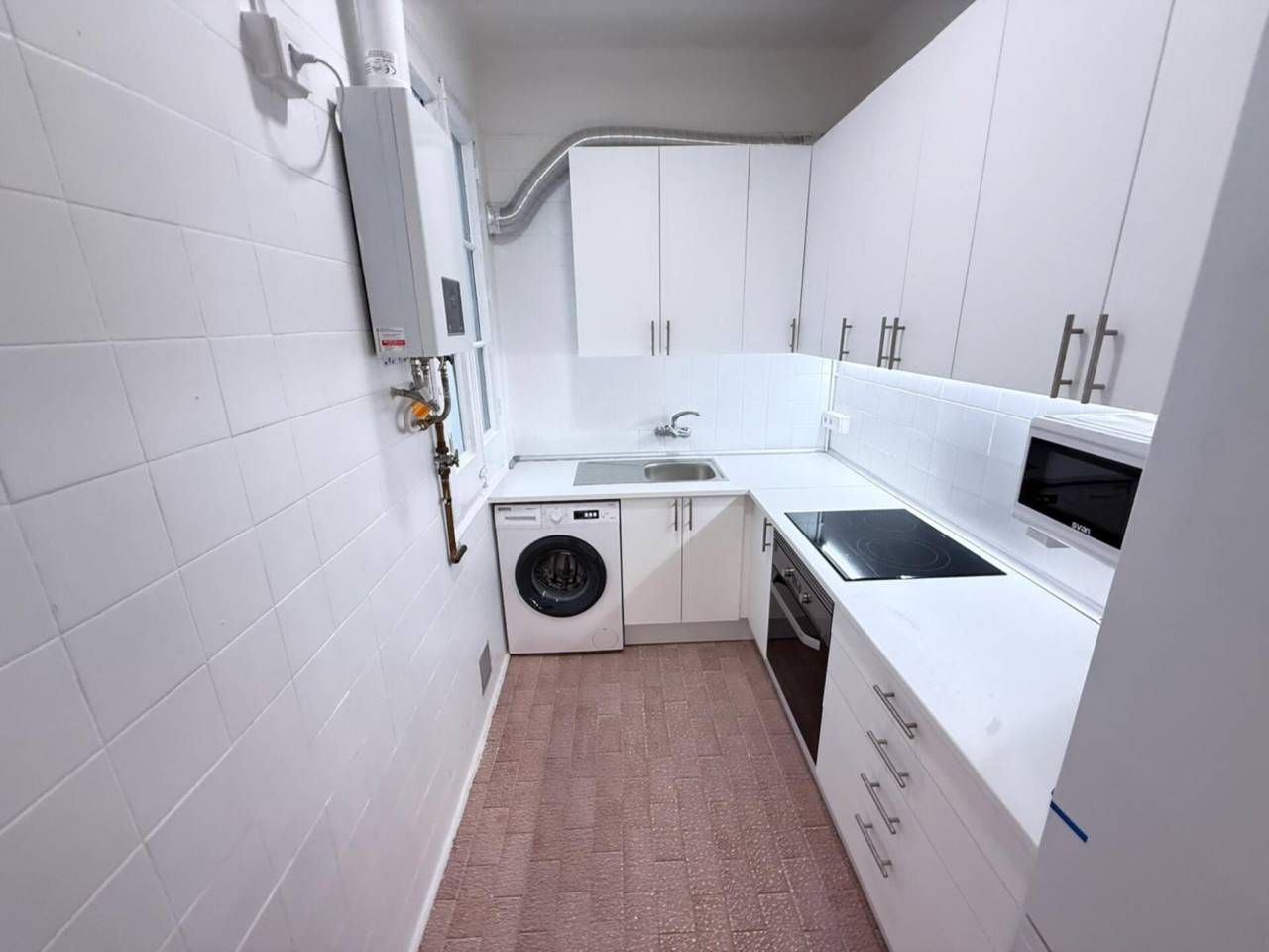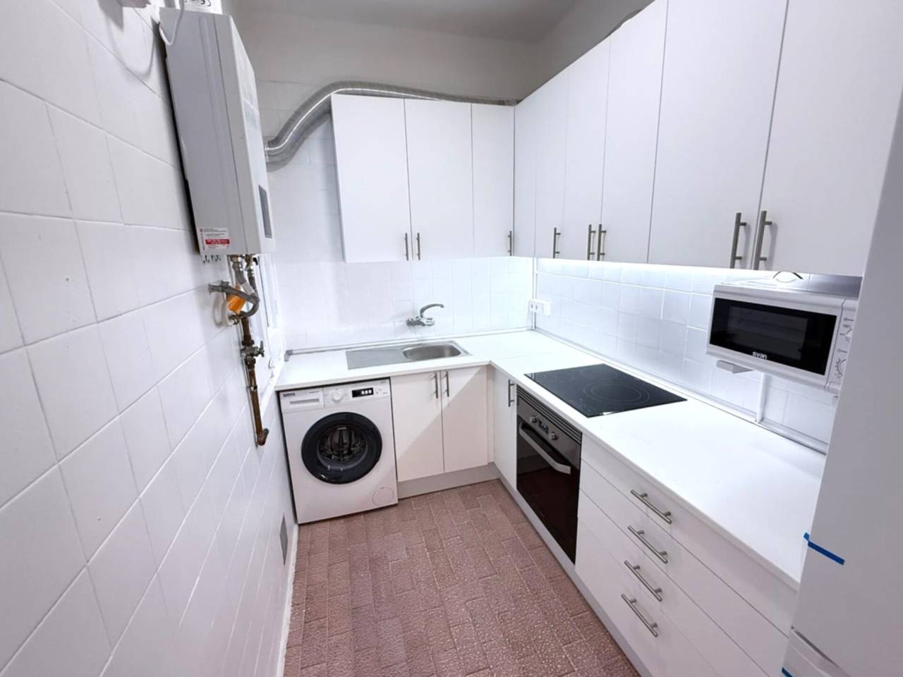 La cocina viene completamente equipada para que no necesites comprar nada, además de lavadora, frigorífico, lavavajillas, microondas y horno.
