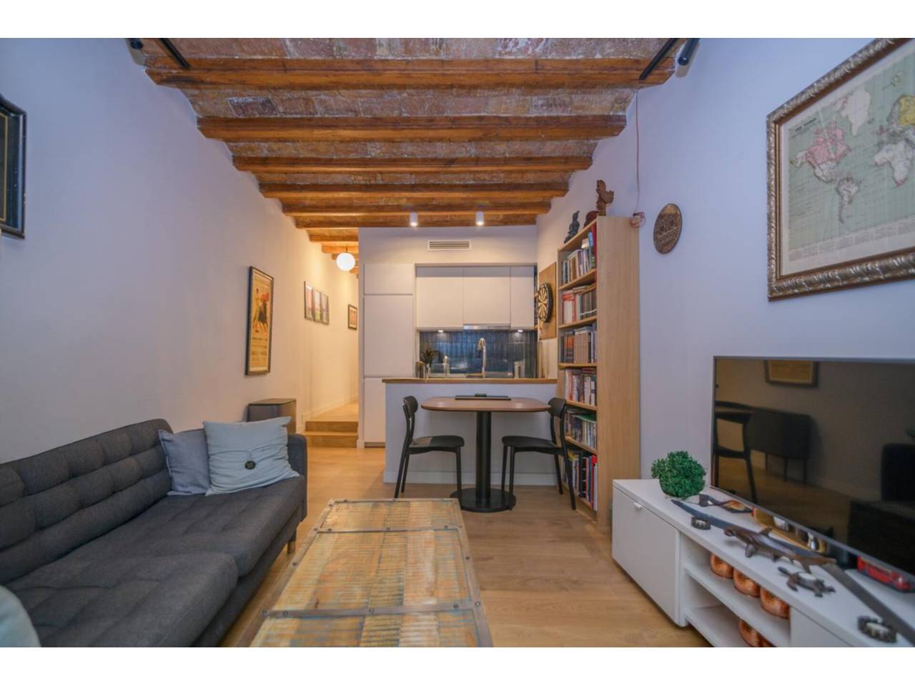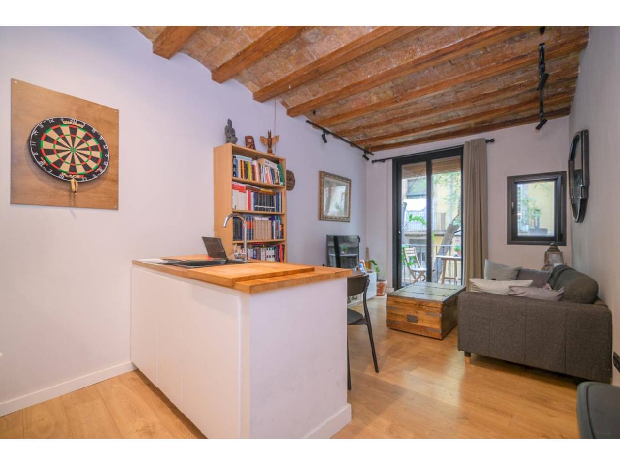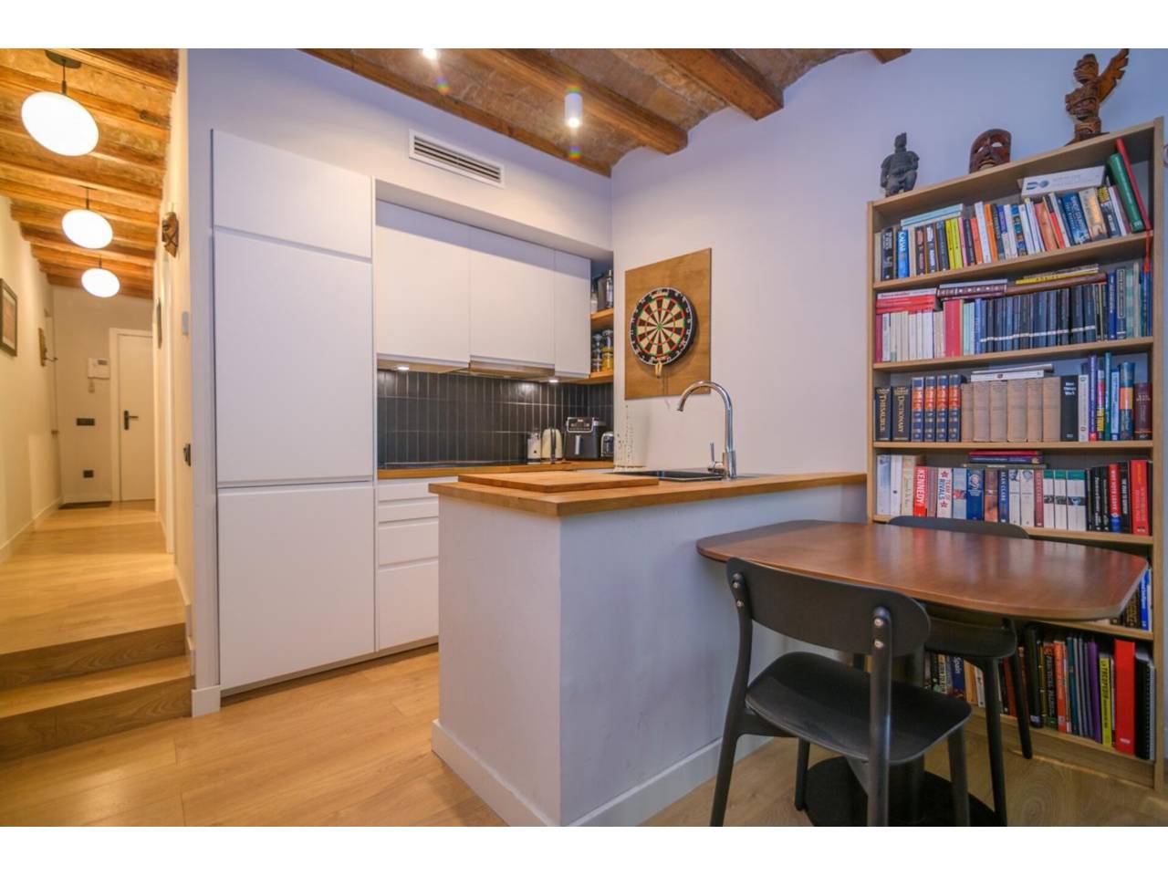 Se distribuye en un luminoso salón-comedor exterior con balcón y cocina americana integrada, equipada con electrodomésticos panelados y de última generación (inducción, horno, campana extractora, nevera, lavavajillas y lavadora). Dispone además de un dormitorio doble con armario y un elegante baño con amplio plato de ducha tipo lluvia. La reforma ha sido integral, incluyendo la instalación eléctrica. Los suelos de parquet, los techos altos con volta catalana y vigas de madera aportan carácter y atractivo adicional a la vivienda.